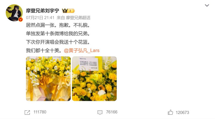 然而,就在粉丝们数花篮数得不亦乐乎时,刘宇宁突然发现漏掉了一个重要人物——黄子弘凡的花篮。他立刻补发第10条微博致歉:“居然点漏一张。抱歉。不礼貌。单独发第十条微博给我的兄弟。下次你开演唱会我送十个花篮。我们都十全十美。”并直接@对方,幽默又真诚的补救方式让网友大赞:“这情商,活该他火!”