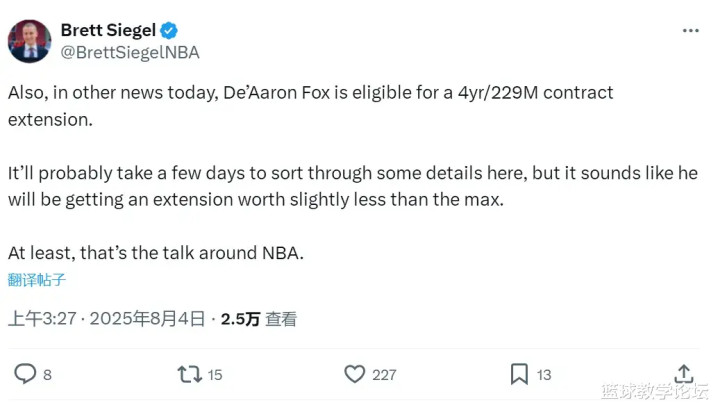 北京时间8月4日,ClutchPoints记者Brett Siegel报道,从今天开始,福克斯有资格和马刺签下4年2.29亿美元的提前续约合同。双方有意达成提前续约,需要几天的时间探讨合同细节。福克斯可能会让步,以略低于这个价格续约。