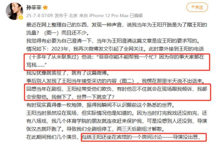 直到今年七月,孙菲菲偶然发现网友指责她当年的澄清是“蹭王阳流量”。