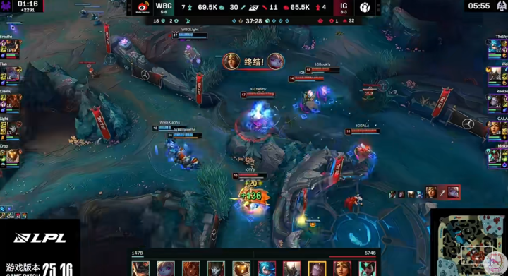 最近IG总是可以在劣势的情况下实现翻盘,而且无论对手是谁。今天对战WBG,第一局又是前期巨大劣势,经济差距在30分钟达到了1万多,但是2-9的Theshy抓住机会带头冲锋,居然硬生生帮助IG开辟出了一条翻盘生路。最终IG在38分钟逆转比赛击败了WBG。