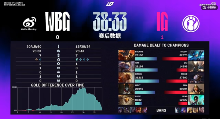 IG劣势反而是拿到了大龙和电龙魂,37分钟经济仍然落后的情况下,此时的WBG已经不敢和IG接团了,最终被IG反碾压。