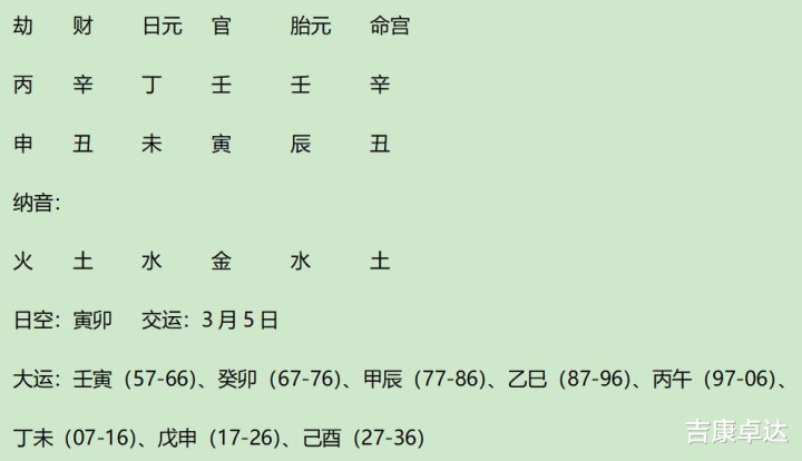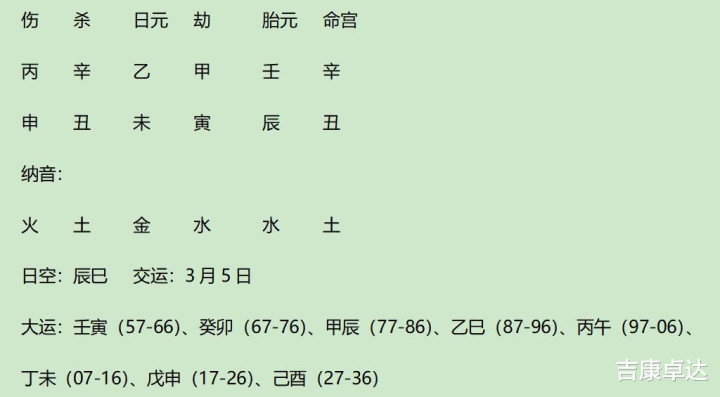 此年,甲劫生丙伤,丙伤制辛杀;大运辰与时支寅拱卯,流年寅与大运辰拱卯,小限未合卯。