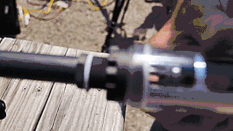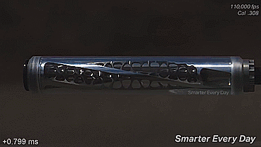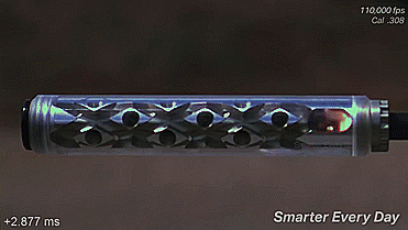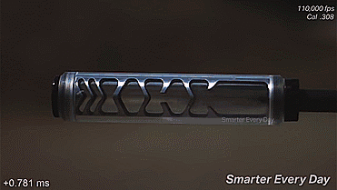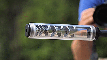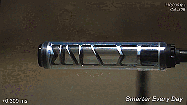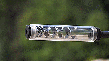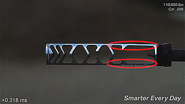 当用高速摄像机放慢速度后我们可以看到,这款消音器的设计比之前的消音器要优异得多,因为这款消音器能将所有的火花和绝大部分的气体都锁留在仓内,当开枪产生的火花触及到消音器端口处时,火花并没有从端口处溢出,反而是在端口处来回徘徊,并在内部慢慢的消散,所以从技术上讲,这款消音器的设计要优于之前的消音器,比较适合用于夜间作战。