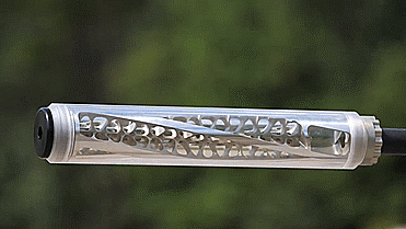 这款消音器最大的特点就是它内部挡板分布是不均匀的,其与枪口连接处的仓体会大一些,而在端口处的仓体则相对小一些,我们并不知道这样的设计是否有利于消音器的工作,但从理论上来说,这种设计应该是可行的。
