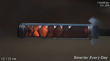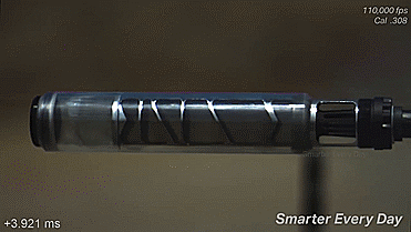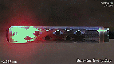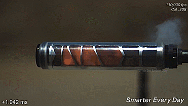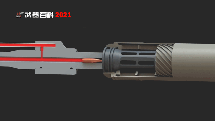 通过高速摄像机我们可以看到,当扣下扳机后,子弹携带着滚滚的烈火从枪口呼啸而出,火焰瞬间就填满了消音器内部所有的仓室。
