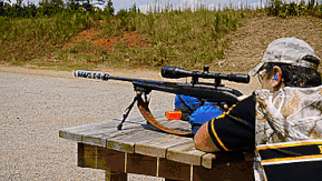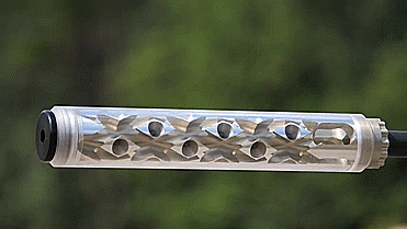 首先让我们选取一个尺寸较小,内部隔板比较紧凑的消音器,将这款消音器装在使用7.62毫米口径的狙击步枪上,看看这款消音器是如何放缓枪口喷射出来的高压气体的。