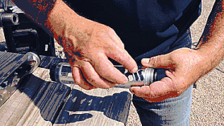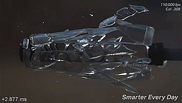 最终在内部气压的推动下,塑料外壳完全的飞了出去,通过高速摄像机我们可以看到,由于消音器尺寸较小的缘故,枪膛内的高压气体无法充分的在每个隔段之间弥漫开来,从而使得消音器尾部气压过高,并导致了塑料外壳的飞离。