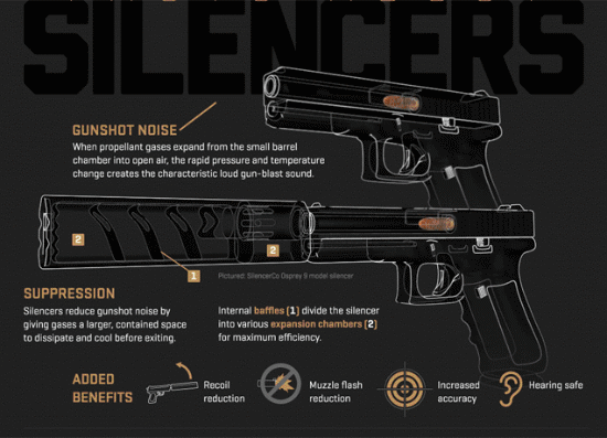 我们都知道,枪械在射击时发出的声音主要是高速飞行的子弹与空气形成摩擦产生的音爆,此外子弹里的火药在离开枪膛时,火药剧烈膨胀也会产生爆鸣声。所以,消声器并不能够完全消除射击时的枪响声,只能降低枪响声,就连经过精心定制的专业消声器,也不能保证射击时不发出一点声音。