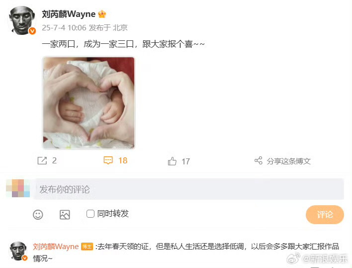 “一家两口,成为一家三口,跟大家报个喜~~”——7月4日,演员刘芮麟(@刘芮麟Wayne)在微博晒出一张温馨的“一家三口”比心照,正式官宣结婚生子!照片中,刘芮麟与伴侣的手环绕着新生儿的小手比心,画面甜度爆表,瞬间引爆全网热议。