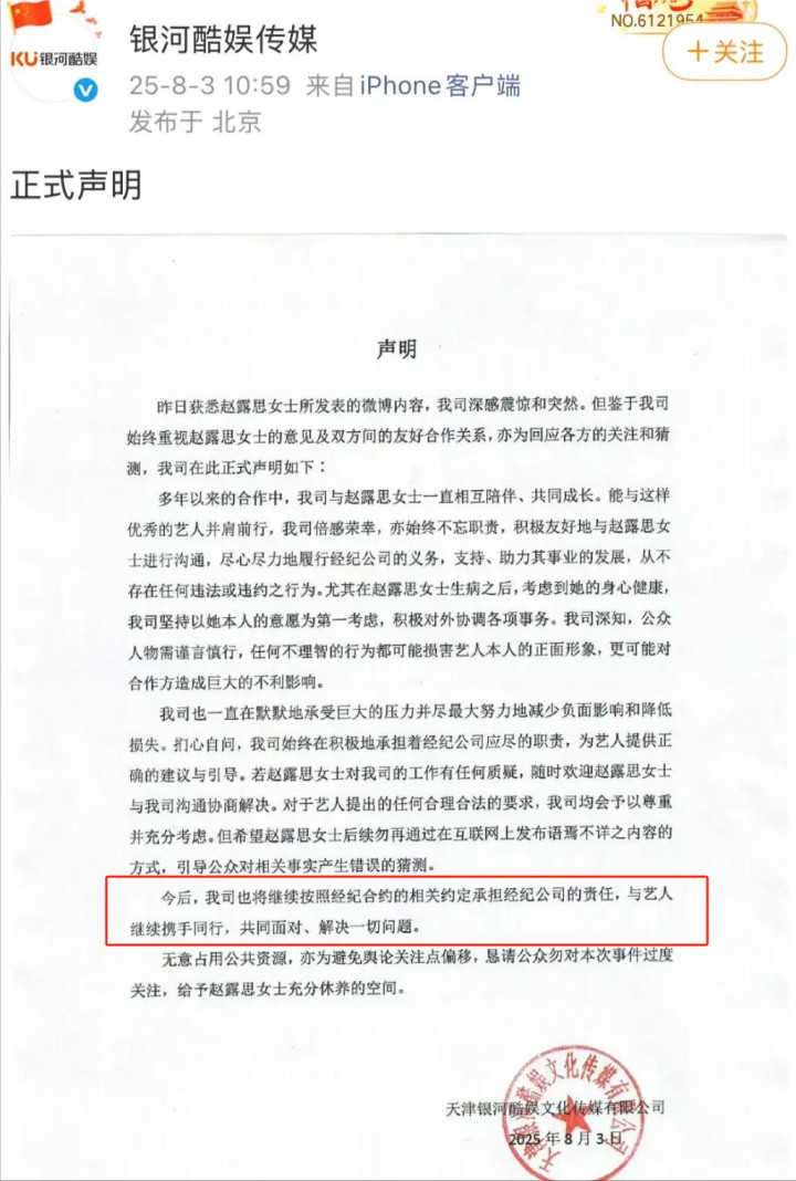 她所在的经纪公司却丝毫不慌,拿出一副“你翻不了天”的架势,还假惺惺的发布声明:将与艺人携手前行,共同面对解决一切困难!