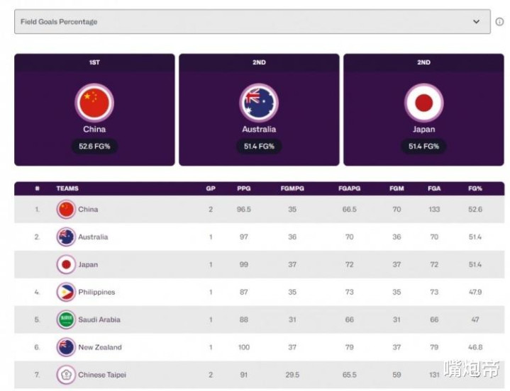 另外还有一个重要的数据,就是两场之后,男篮的投篮命中率现在是52.6%,位居所有球队的第一位。排名第二的是澳大利亚投篮命中率51.4%,日本队也是跟澳大利亚一样的命中率,排名第四的是菲律宾的47.9%的命中率,排名第五的是沙特,排名第六的是新西兰队,全部比男篮的命中率要更低,说明中国男篮的进攻简直是无解的。