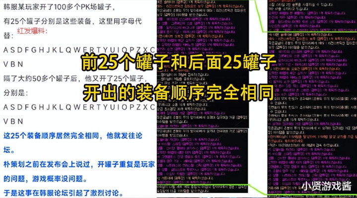不过在时隔没多久,7月出现的大瓜却把主策划的脸给打了,怎么说呢?韩服有玩家开了100多个PK罐子,结果让人意想不到的是,在前面开出25件装备,时隔50多个罐子后,后面开出的25个罐子的装备顺序,居然和前面的25个相同。