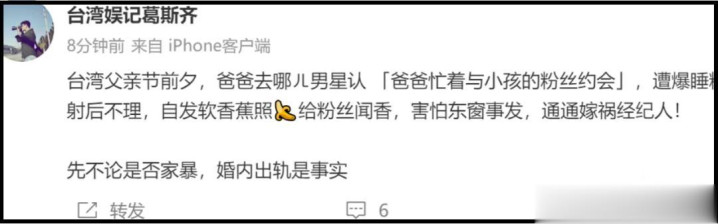 知名娱记葛斯齐通过社交平台又爆料了,他称参加过《爸爸去哪儿》的其中一位男嘉宾,在台湾省的父亲节前夕私联孩子粉丝,且发生了不正当关系。事后这位父亲翻脸不认,还把事情全都推给自己经纪人。