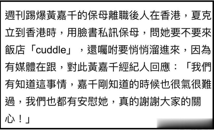 值得一提的是,离婚期间,曾经在夏克立家中就职的菲律宾保姆爆料,她在辞职后,人在香港还收到了夏克立的消息,邀请她到饭店小聚。