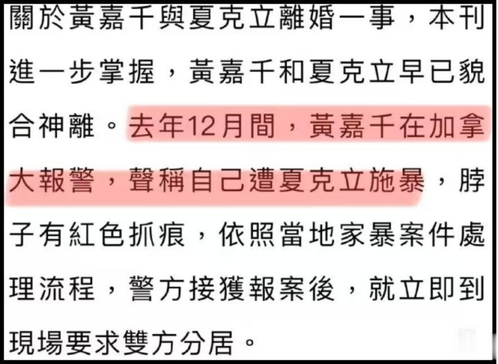 然而温馨的表象没有维持几年,2022年有台媒曝出黄嘉千主动提出离婚,原因是在加拿大,夏克立曾经对她和女儿施暴,并向媒体展示伤势照片。舆论发酵后,夏克立出面辟谣,并称黄嘉千身上的伤是自己抓挠的。