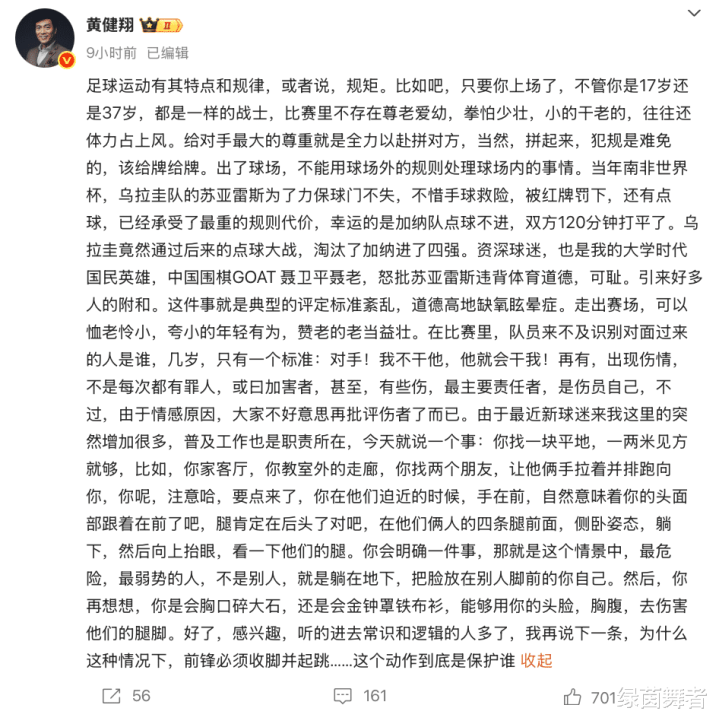 而黄健翔的说法,也再度引爆了舆论。有球迷评论道:“黄健翔是意大利球迷,为意大利人辩护很正常!”还有球迷写道:“说的是人话吗?什么叫主责是伤员自己?经典受害者有罪论!”不过绝大多数球迷,还是支持黄健翔的观点,在足球场上,并不是谁弱势、谁伤的重谁有理,一次正常的对抗,不能因为导致了严重后果,就去责怪所谓的“加害者”。