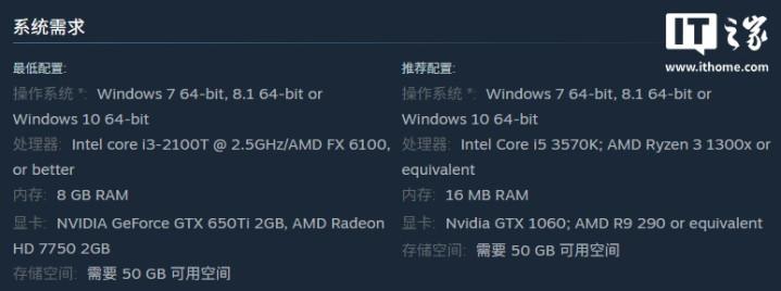 Steam页面配置要求显示,《港警成双:来自城寨》推荐GTX1060及以上显卡,需要50GB存储空间。