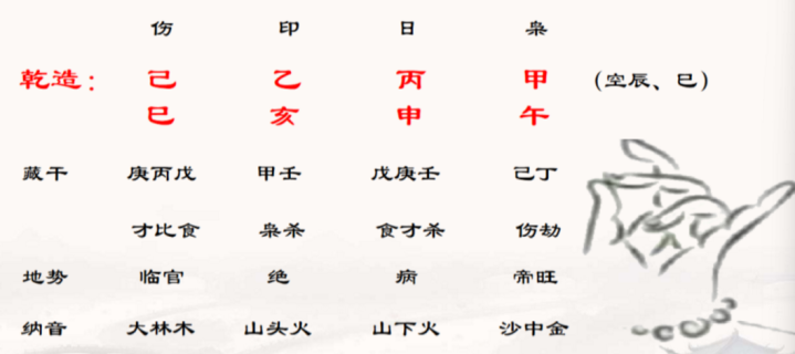 八字乾造:你生于己巳年、乙亥月、丙申日、甲午时(日空:辰巳)