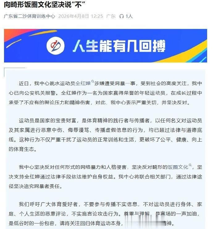 广东省二沙体育训练中心公告:全红婵遭网暴,中心已向公安机关报警,坚决反对网络暴力与畸形饭圈文化,将依法追责,维护运动员权益。