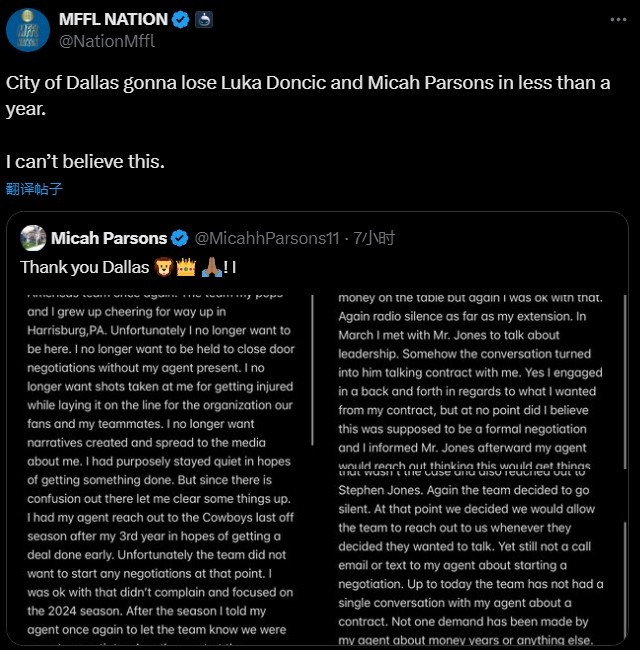 独行侠媒体MFFL NATION转发米卡-帕森斯的申请交易文章并写道:“达拉斯市将在不到一年的时间内失去两位球星卢卡-东契奇和米卡-帕森斯。我简直不敢相信。”