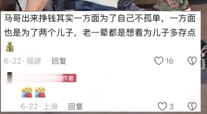 在马景涛晕倒后,网上对于他打工的行为议论纷纷,有位网友就在吴佳尼评论区留言:马景涛之所以出来挣钱,一方面是为了不孤单,另一方面也是为了两个儿子多存钱。