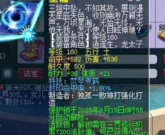 上面是一把160级拥有着两个蓝字效果的武器,这两个蓝字效果是1.6%的封印命中率和焚琴煮鹤,焚琴煮鹤的作用是能够降低对方全体单位的法术伤害,上面的这把武器还增加了36点耐力和21点的体质。可以给辅助门派的玩家使用。在任务和PK中都有用,可以降低对方所造成的伤害。不过也不要期望这种装备的价格能够卖得太高。像上面的这种群体的特技都要比小特技便宜。
