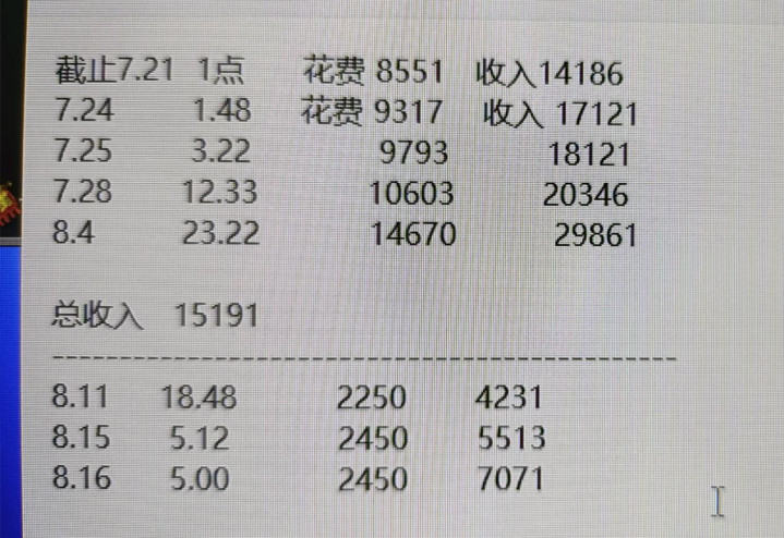 知道上面的这些数字代表的是什么吗?上面的这些数字所代表的是一个畅玩服务器的收益。咱们只看这位玩家在七月份和八月初的收益,上面的这位玩家在两个星期的时间内就赚了1.5W,这么算下来一个月能赚3W呢。