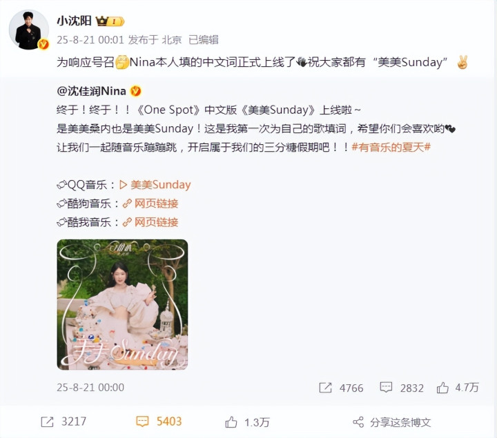 而在21日的零点,小沈阳就已经在自己的社交账号上发文为女儿的中文版歌曲打call了,将老父亲的宠爱以及对女儿的骄傲展现得淋漓尽致。