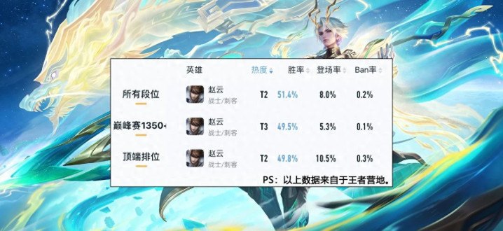 这次加强后,赵云在三分段中的数据都是处于提升范围,但幅度不算太高,只有巅峰1350的胜率是提高了1%左右,其余都在0.7%~0.8%。