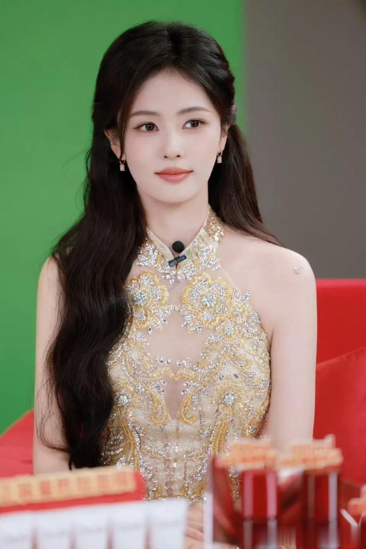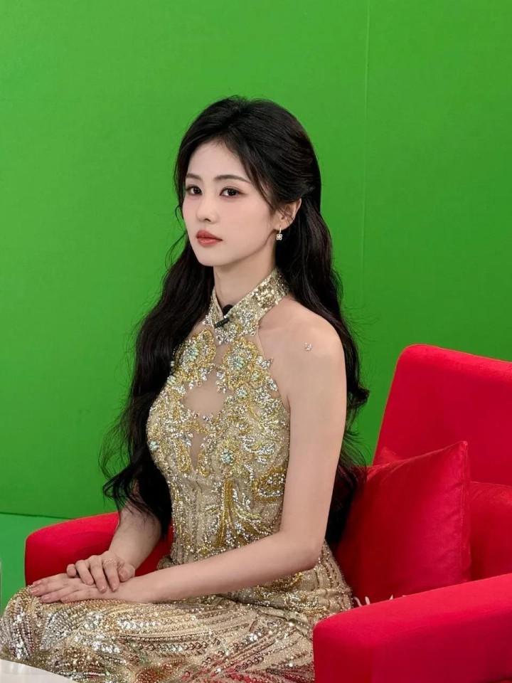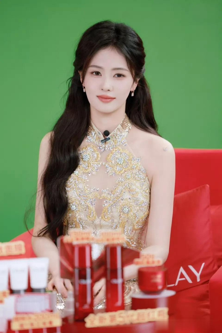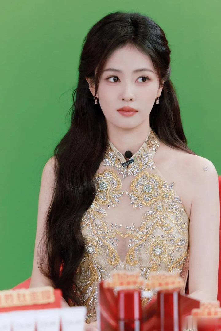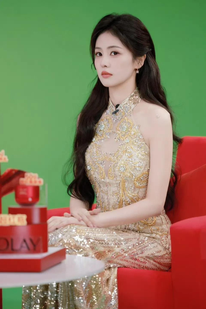 白鹿直播生图, 金色刺绣旗袍优雅吸睛