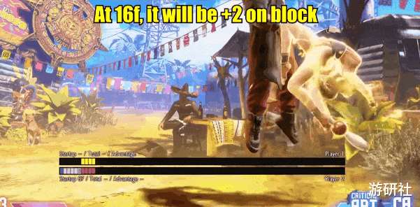 但这个操作同样要冒极大的风险,上面我说的“稍微延迟一段时间”,实际上指的是“精确延迟到第15或16帧”,因为如果少于15帧,攻击会直接打空,给Blaz一个完美的确反机会,多于16帧,帧数差仍然只有“+1”,Blaz的选择依旧有优势。