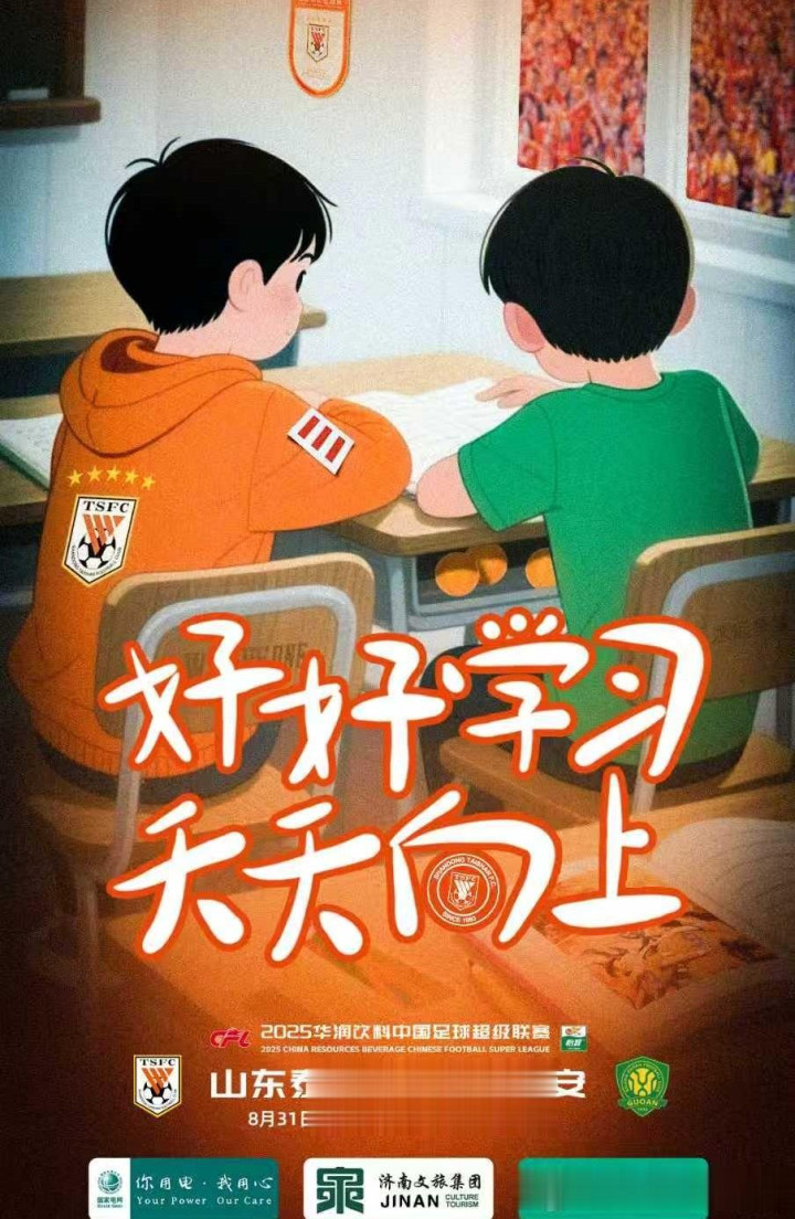 泰山俱乐部官方海报为“好好学习,天天向上”,以两名小学生辅导功课为基础,背部泰山五座联赛冠军星星闪耀,虽然本赛季泰山实力不如国安,但提前投降显然不是泰山作风,这场比赛双方都会打起精神。